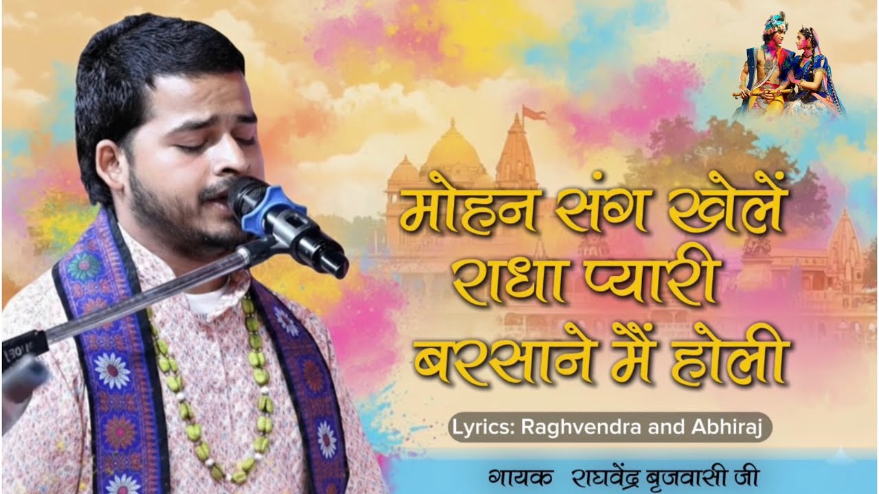 मोहन संग खेले राधा प्यारी, बरसाने में होली, सबके मन भाये दिल में समाये, ऐसी सुन्दर जोड़ी।। इत नंद गाम के कान्हा है, और संग ग्वालन की टोली, उत बरसाने की राधा है, संग में हैं सखियाँ भोली, और अबीर गुलाल भर भर मारे, मुख से मली है रोली, बरसाने में होली, मोहन संग खेलें राधा प्यारी, बरसाने में होली, बरसाने में होली।। कांधे कमरिया हाथ लकुटिया, ग्वाल बाल सब आए, माखन चोर भी आज रंग की, गागर भर कर ले आए, भर भर पिचकारी सब ग्वालों ने, सखियाँ ऊपर छोड़ी, बरसाने में होली, मोहन संग खेलें राधा प्यारी, बरसाने में होली, बरसाने में होली।। जो भी गावे फाग प्रेम का, वो भी रंग रंग जाए, राधा-कृष्ण की युगल छवि, उसके मन में बस जाए, सबके के मन भाए दिल में समाये, ऐसी सुंदर जोड़ी, बरसाने में होली, मोहन संग खेलें राधा प्यारी, बरसाने में होली, बरसाने में होली।। नील-पीत और लाल गुलालों, से अम्बर रंग आया, भक्तों ने भी है आज प्रेम, गहरा ये रंग चढ़ाया, ‘अभिराज राघवेंद्र’ गावें महिमा, ऐसी रंगोली होली, बरसाने में होली, मोहन संग खेलें राधा प्यारी, बरसाने में होली, बरसाने में होली।। मोहन संग खेले राधा प्यारी, बरसाने में होली, सबके मन भाये दिल में समाये, ऐसी सुन्दर जोड़ी।।